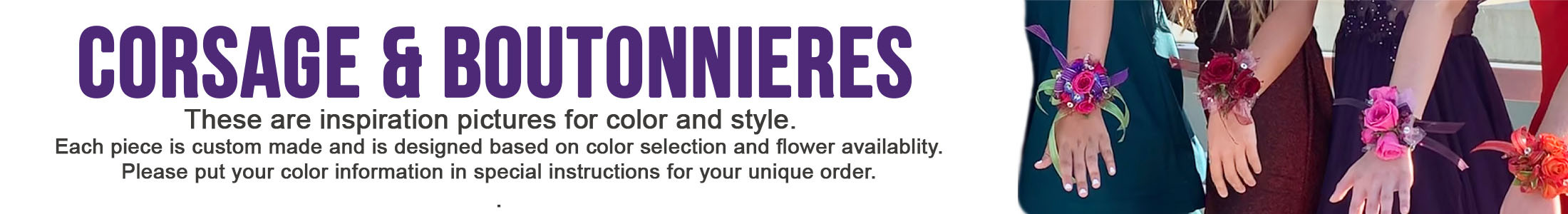 Corsages and Boutonnieres are for PICK UP ONLY. During the checkout process please select one of our three convenient locations that you would like to pick up your order from. If you have any special requests, please specify this in the 'Special Pick Up Instructions' box during checkout, or contact the store directly.